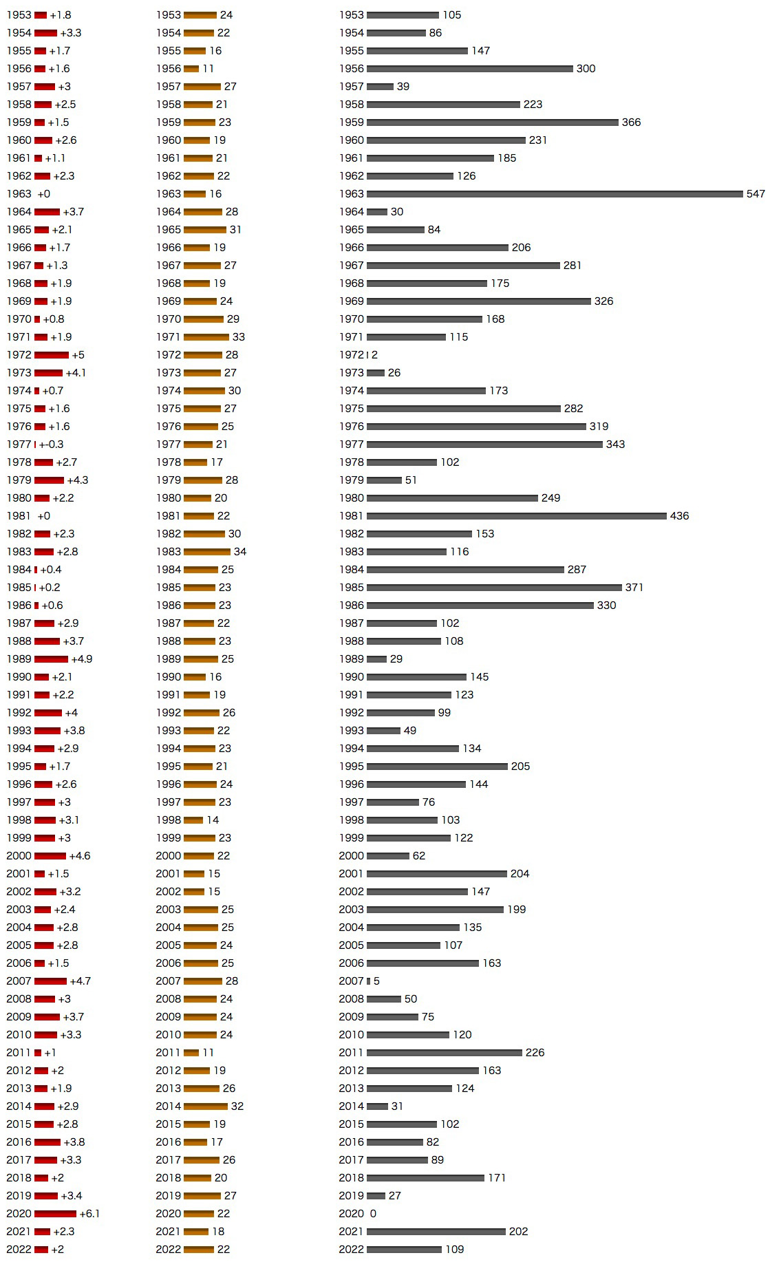 雪は,気温が低いと降るのではない。 実際,気温が低いと降るものなら,氷点下の沙漠には雪が降らねばならない。 そして氷点下の沙漠は,日照時間の多寡を決めるのは気温ではないことも示す。 気象にいくら疎くても,このくらいのロジックはわかるだろう。 降雪は,雪を降らせる雲ができないことには始まらない。 日照時間の多いことは,そのまま降雪の少ないことである。 以下は,釧路 (北海道) と富山 (富山県) の<1月の気温,日照率,降雪の深さの推移>をグラフにしたものである。 このグラフで,つぎのことをしかと確認すべし: 特に,降雪量が大きく変動するものだということを,わかるべし。 変動がわからないと,「温暖化だ!」と騒ぐ者になってしまう。 ──「温暖化だ!」と騒ぐ者に変動が見えないのは,一方向に変化していると信じ込んでいる (洗脳されている) ためである。 |