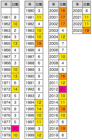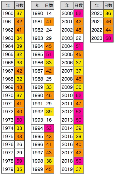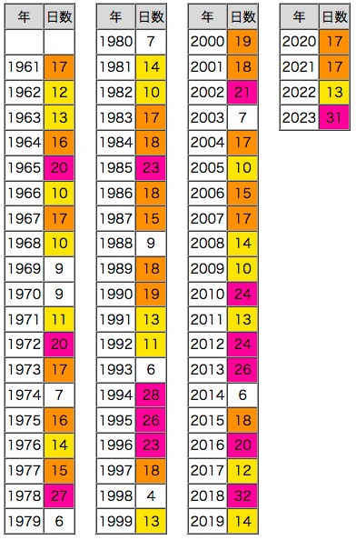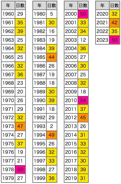紫 : 50日以上,橙 : 40日以上,黄 : 30日以上 |