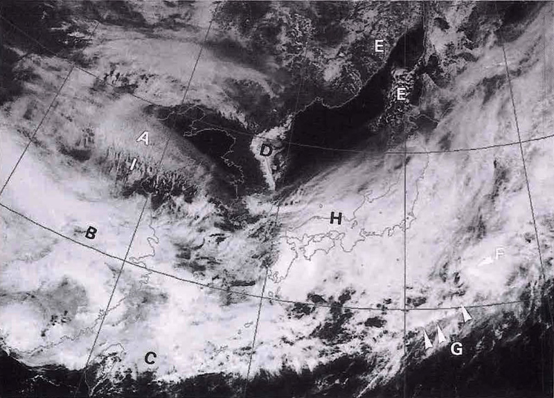 赤外画像では雲域Aより温度が高いため明灰色にみえ、一様な広がりをもっ。