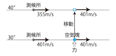 すると,この空気塊は \( 401 - 355 = 46 \) m/秒 の風になる。
