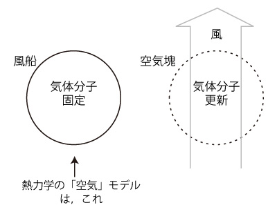 これの意味は,「マクロ的に,外部の空気との混じり合いを無視できる」である。 「外部の空気との混じり合いが無い」のイメージは,風船の中の空気。 そしてつぎの絵を描く: しかし空気塊とは,ほんとうにこのように挙動するものなのか? そして風船だが,それのふつうの様は,「風に流される」である。 「温められて上昇・冷やされて下降」ではない。 空気塊も,「風に流される」というものなのか? 「風に流される」は,空気塊にはあてはまらない。 風船の場合は,空気を押しているのではなく,空気を内容物にした固体を押している。 空気塊は,空気を内容物にした個体ではない。 「風が空気塊を押して動かす」の絵は,風が押す力が空気塊を保ったまま空気塊の中を伝わるという絵である。 これはあり得ない。 風船がメタファになるような「空気塊」の概念は,根本で間違っている。 「空気塊」と言っているそれは,気体分子の閉じた系ではない。 「空気塊」は,これを構成する気体分子が絶えず入れ替わっている。 入れ替わっているが,気体分子の性質・特徴が保たれている。 「空気塊」は,新陳代謝する系なのである。 動的だが現象が定常なシステムは,一個の固定した存在に見えてくる。 「空気塊」は,こういうものである。 「空気塊」には,気体分子入れ替わりの風が通っている。 「空気塊」は, ![]() ちなみに風は,自己生成する系である大気の,自己生成の現象である。 |