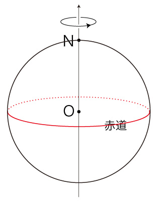 自転は,球体の中心 \( O \) と球面上の点 \( N \) を通る直線を回転軸とし,\( O \) から \( N \) を見て右回りであるとする: