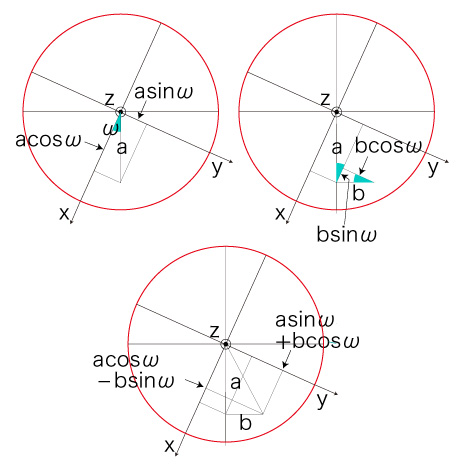 \( R\ cos( P_a + (v/R) \Delta t ) \) と \( R\ sin( P_a + (v/R) \Delta t )\ cos(S_a) \) に,つぎの関係を適用する: