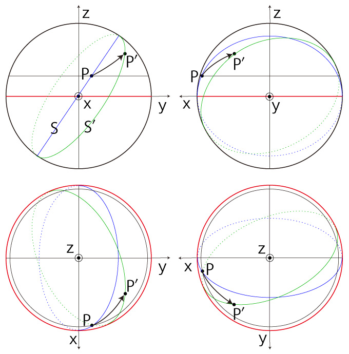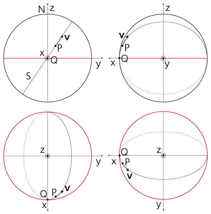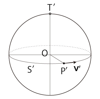 \( (P, \bf{v} ) \)-座標起点を \( Q \), \( (P, \bf{v} ) \)-大円を \( S \) で表す。
