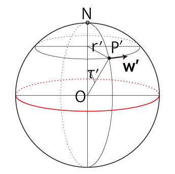 実際,\( \angle{ NOP' } \) の角度を \( \tau' \),\( P' \) からz軸までの距離を \( r' \) とするとき, \[ {\bf w'} = | {\bf w'} |\ \frac{ \vec{ON} \times \vec{OP'} }{ | \vec{ON} \times \vec{OP'} |} \\ | {\bf w'} | = r'\ \Omega \\ r' = R\ sin( \tau' ) \\ \]