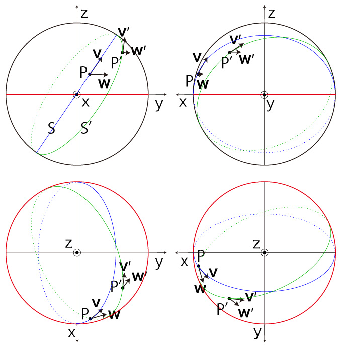 \( P' \) を通り \( \bf{v'} \) が接ベクトルになる大円を \( S' \) とする。