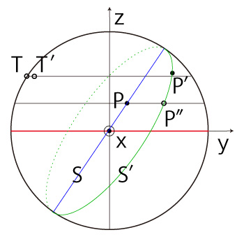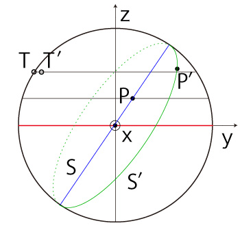 実際, \[ {\bf v'} = |{\bf v'}|\ \frac{ \vec{OT'} \times \vec{OP'} }{ | \vec{OT'} \times \vec{OP'} |} \\ \ \\ |{\bf v'}| = v \]