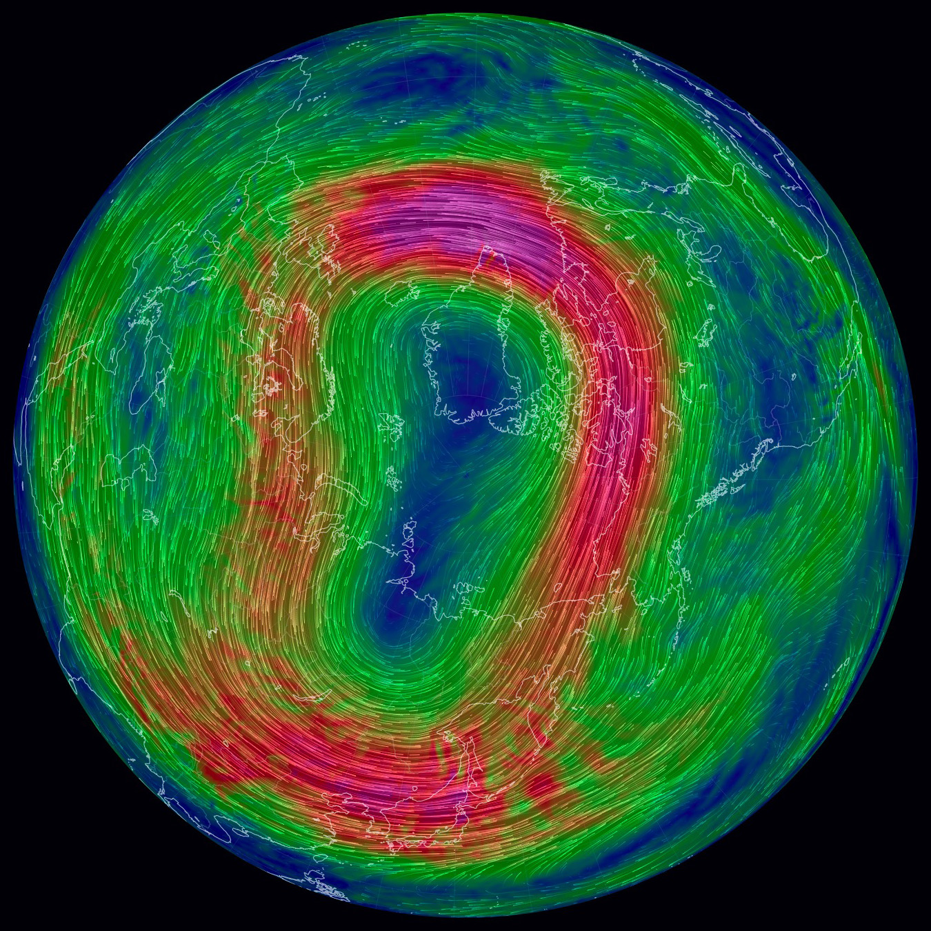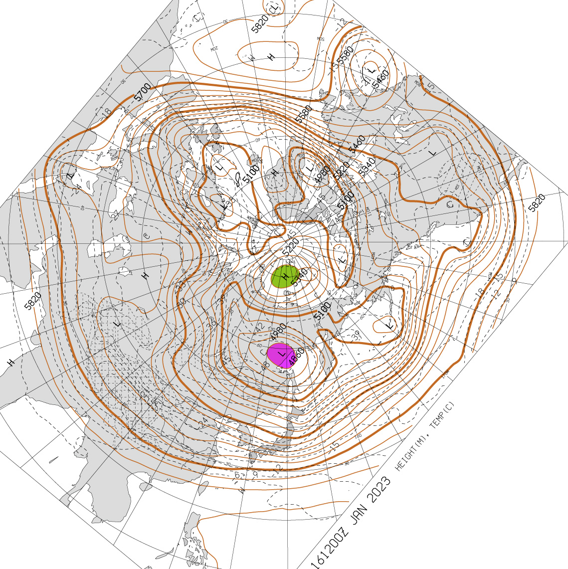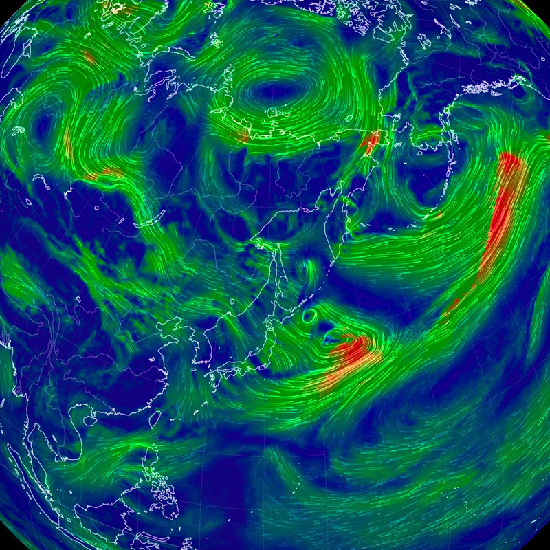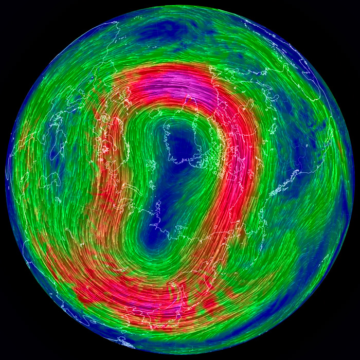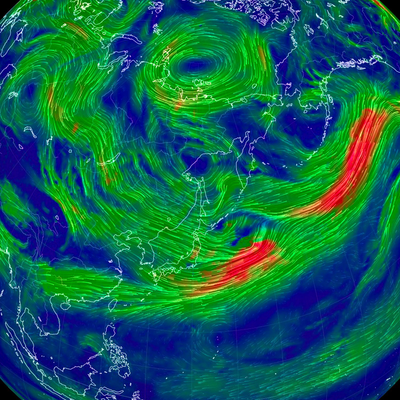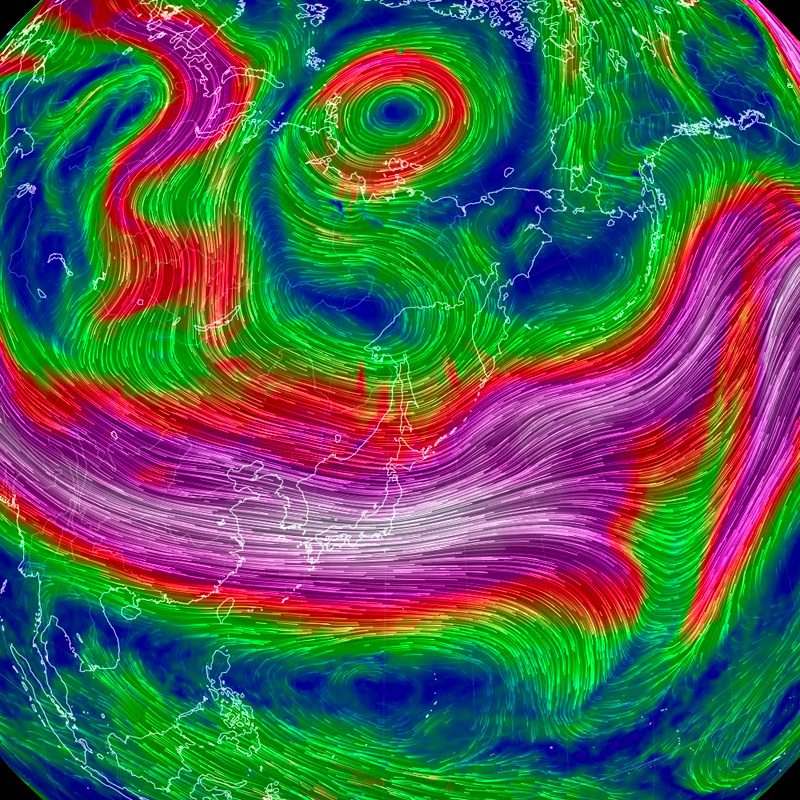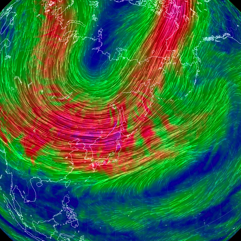 北極を正面に見た図である (東経135度線が縦)。 特徴的なのは,赤色に表示された高速の流れの輪──偏西風の上層──である。 輪の中央はダンベルの形をしている, これは何なのか? 200 hPa 面まで下ると,二つの低気圧が高気圧を挟む形が現れる。 これが「ダンベル」の正体 (構造) である。 |