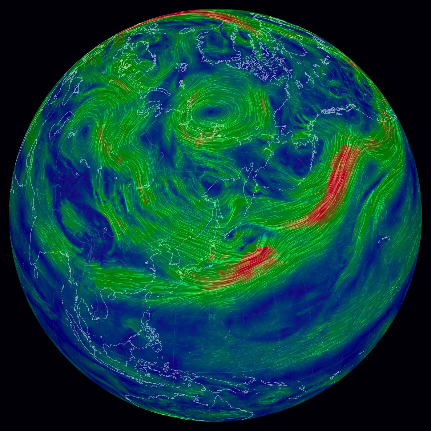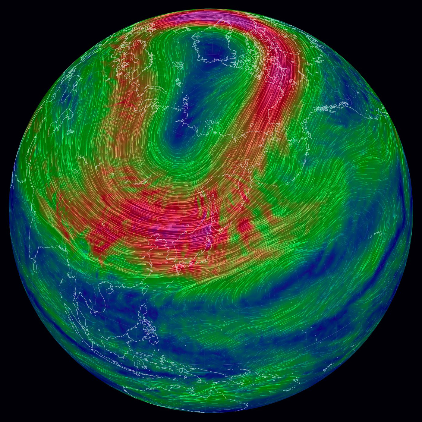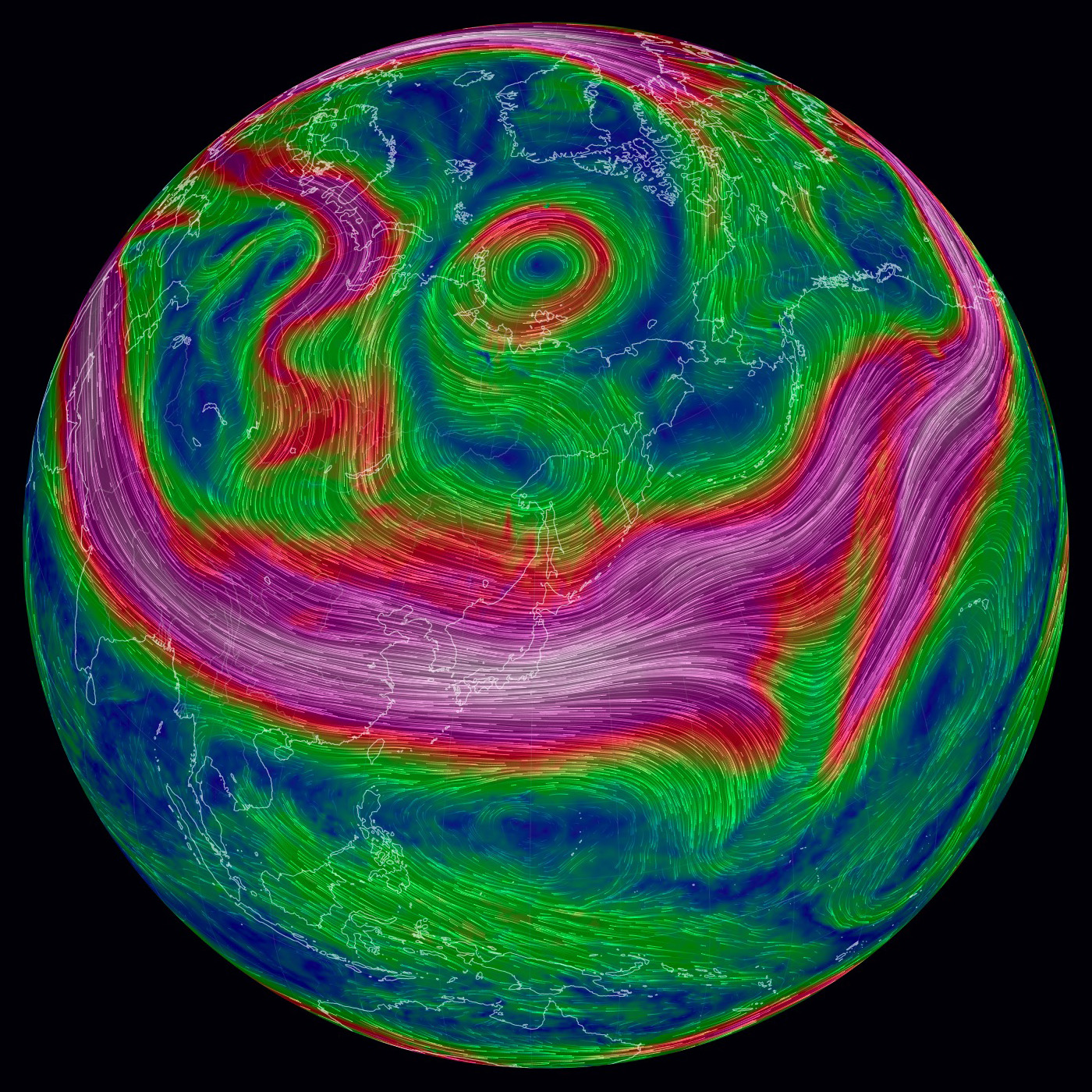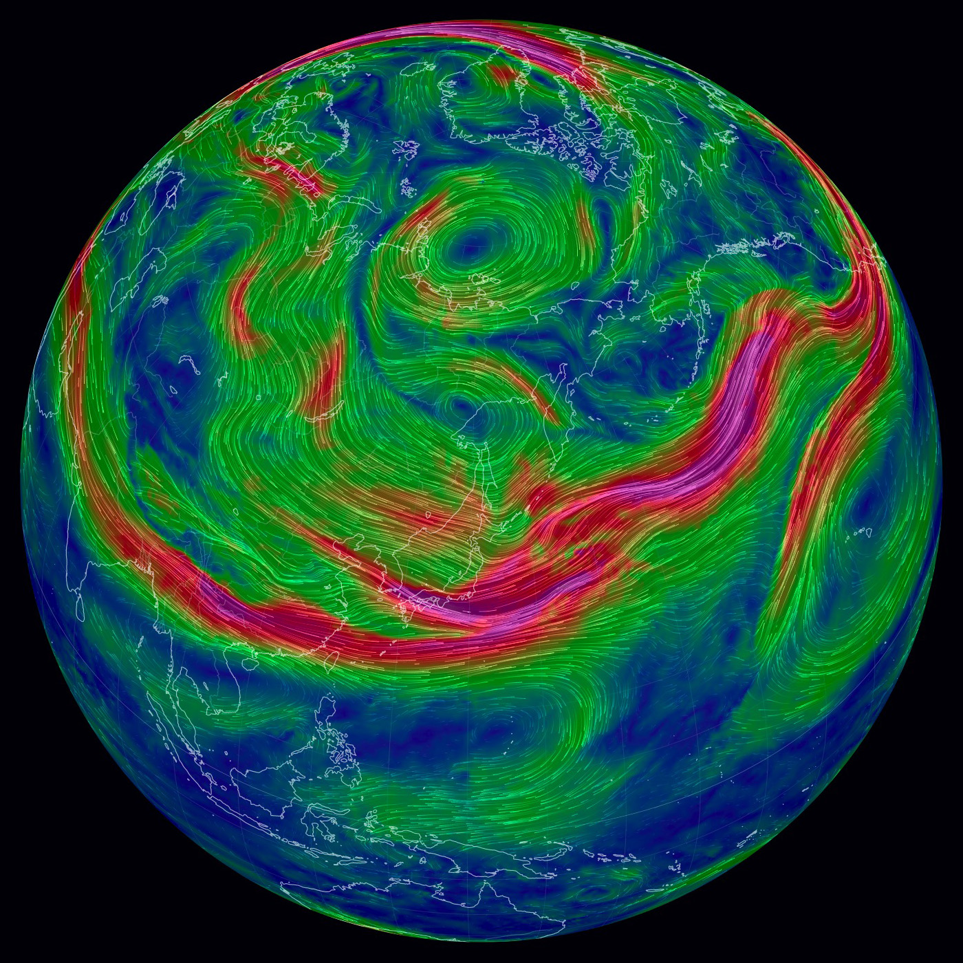 北極を正面に見た図である (東経135度線が縦)。 特徴的なのは,赤色に表示された高速の流れの輪──偏西風の上層──である。 輪の中央はダンベルの形をしている, これは何なのか? 200 hPa 面まで下ると,二つの低気圧が高気圧を挟む形が現れる。 これが「ダンベル」の正体 (構造) である。 |