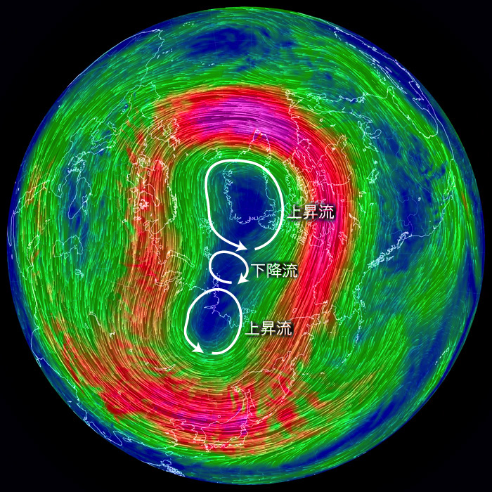 紫の領域が上昇流 (本流) に,その上の北緯80度線上に見える「H」が下降流に,それぞれ対応 |