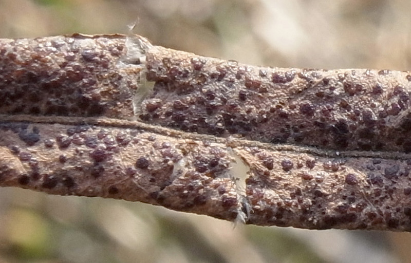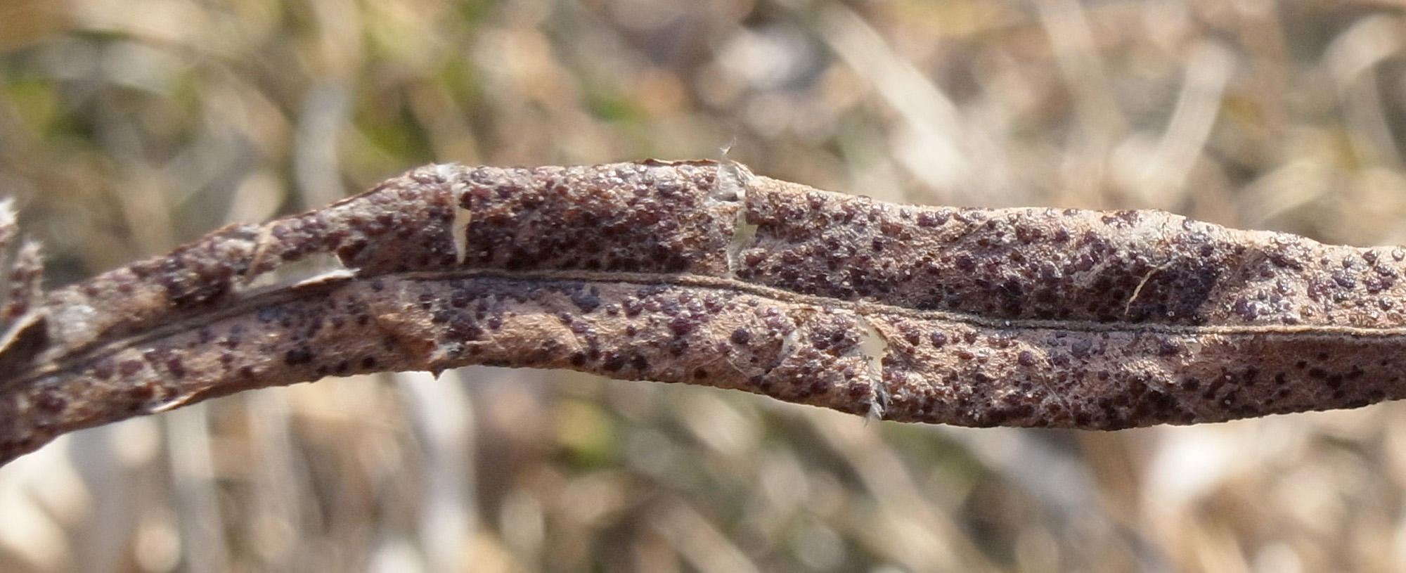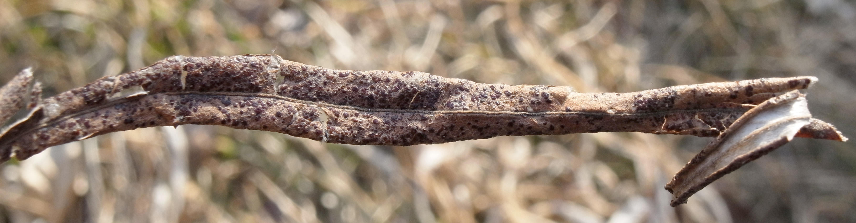キヌヤナギの落葉についたクロイボタケ