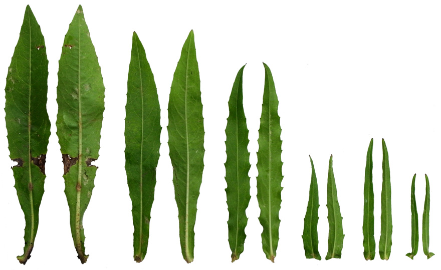 葉の形・大きさの変化 ── 茎の下方から上方へ(画像左から右)