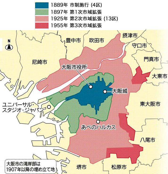 日本経済新聞「「大大阪」 歩みと挫折 市制130年, 3度の拡張」から部分引用」